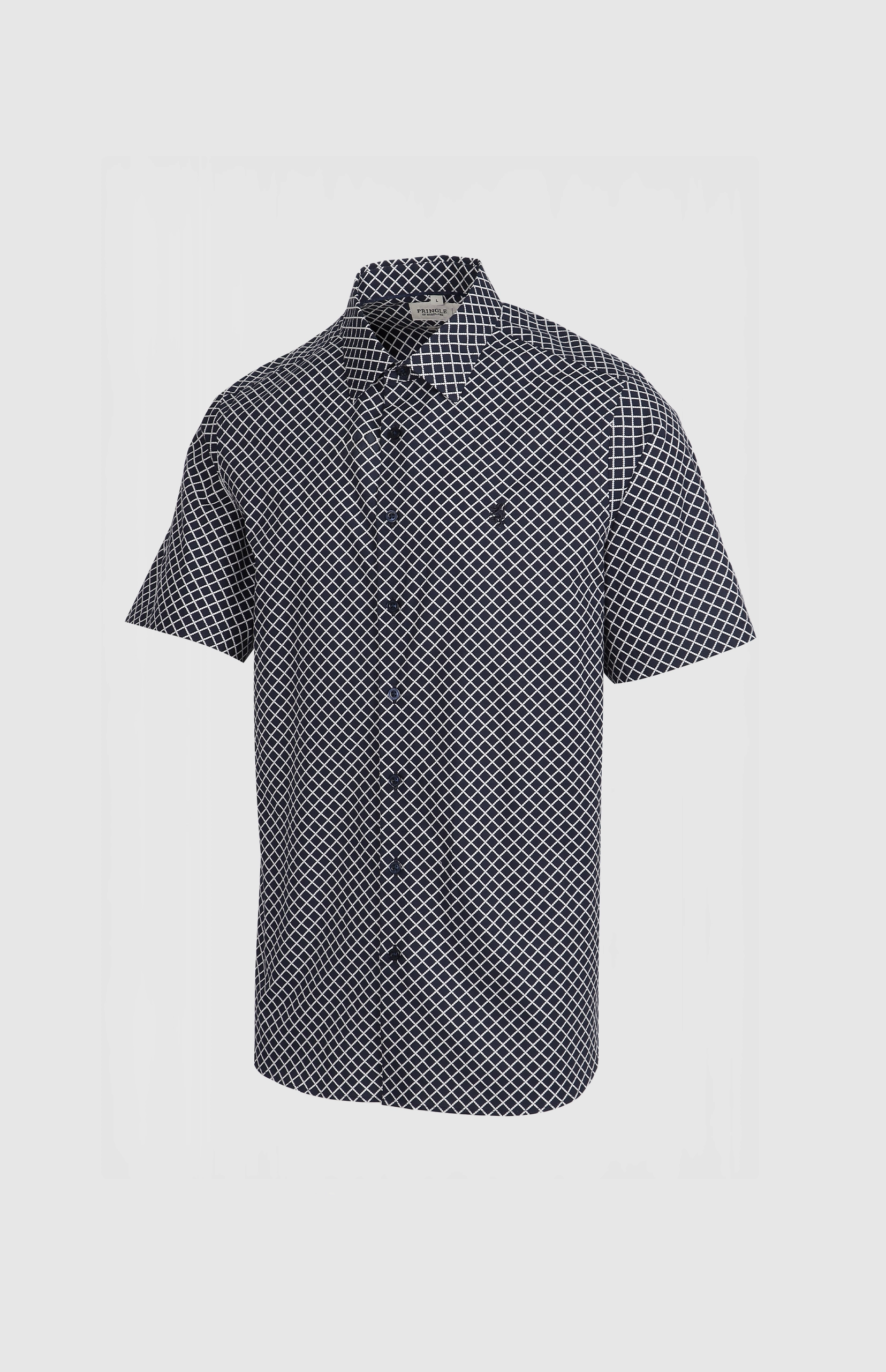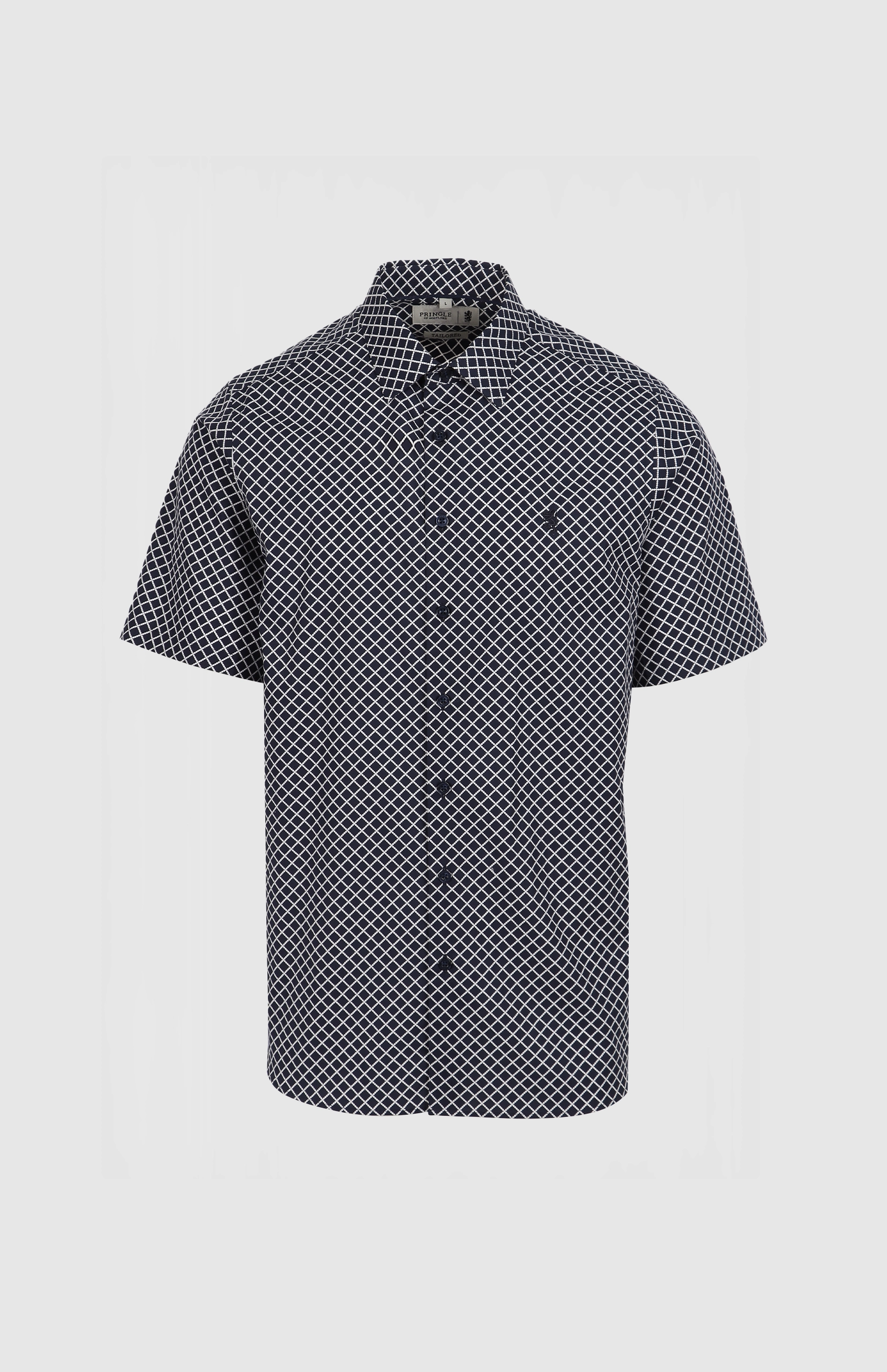 The Pringle Tailored Short Sleeve Shirt is crafted for the modern man, combining comfort, style, and versatility. Made with a stretch base of 98% Cotton and 2% Spandex, it offers enhanced flexibility and breathability, ensuring all-day comfort. Designed with a tailored fit and back darts, this shirt provides a streamlined, polished silhouette. The geometric print adds a modern touch, while the iconic Pringle lion emblem embroidered on the left chest delivers a timeless nod to heritage. Perfect for smart-casual or semi-formal settings, this shirt is a reliable choice for any occasion.