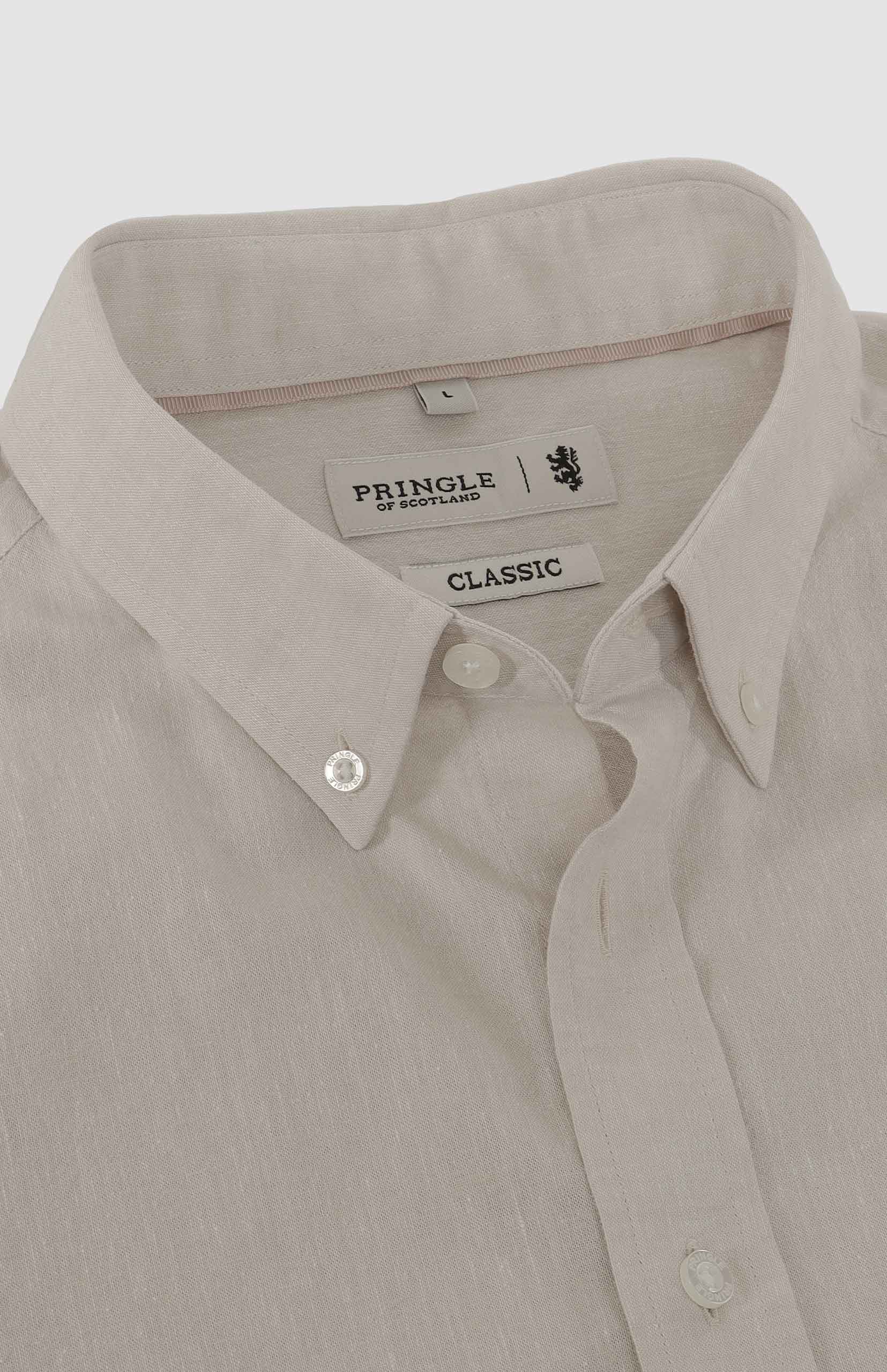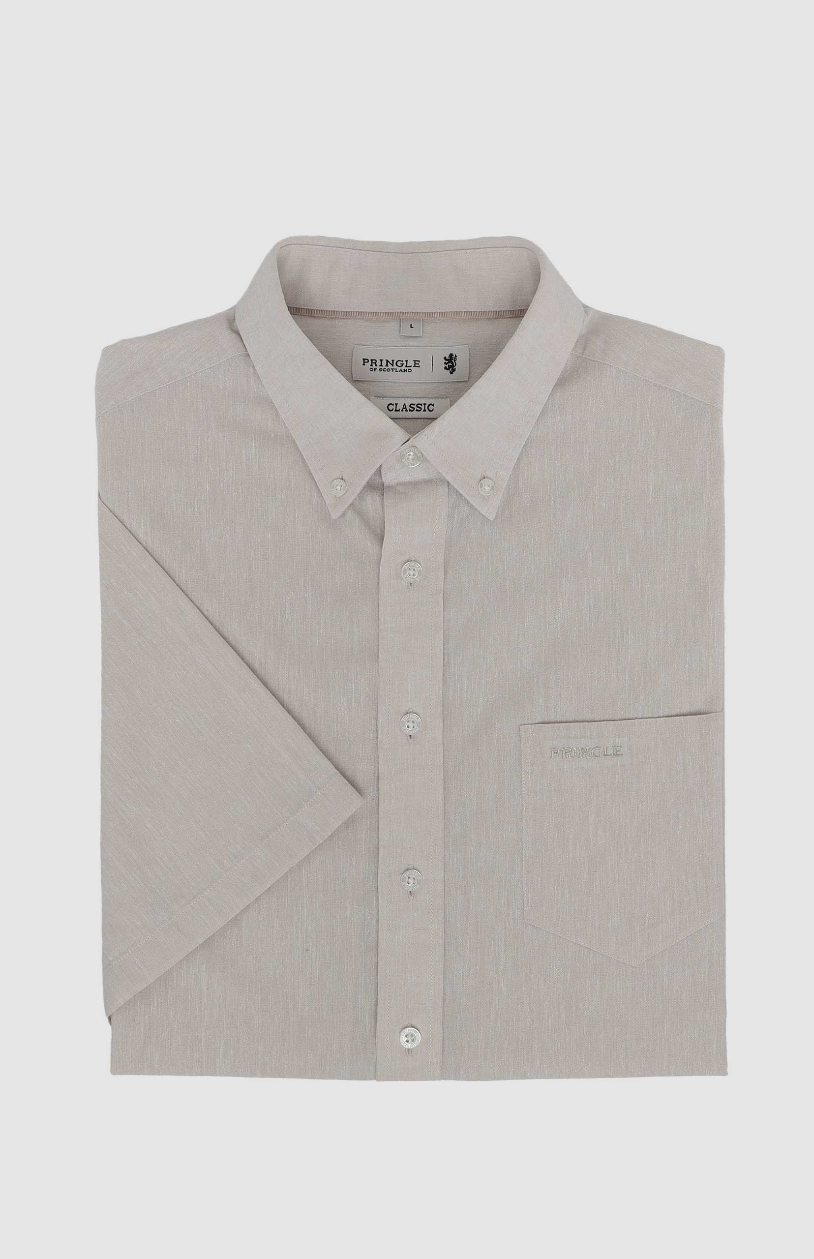 A lightweight short-sleeve linen-blend shirt designed for breathability and comfort, finished with a clean button-down collar and subtle Pringle embroidery.