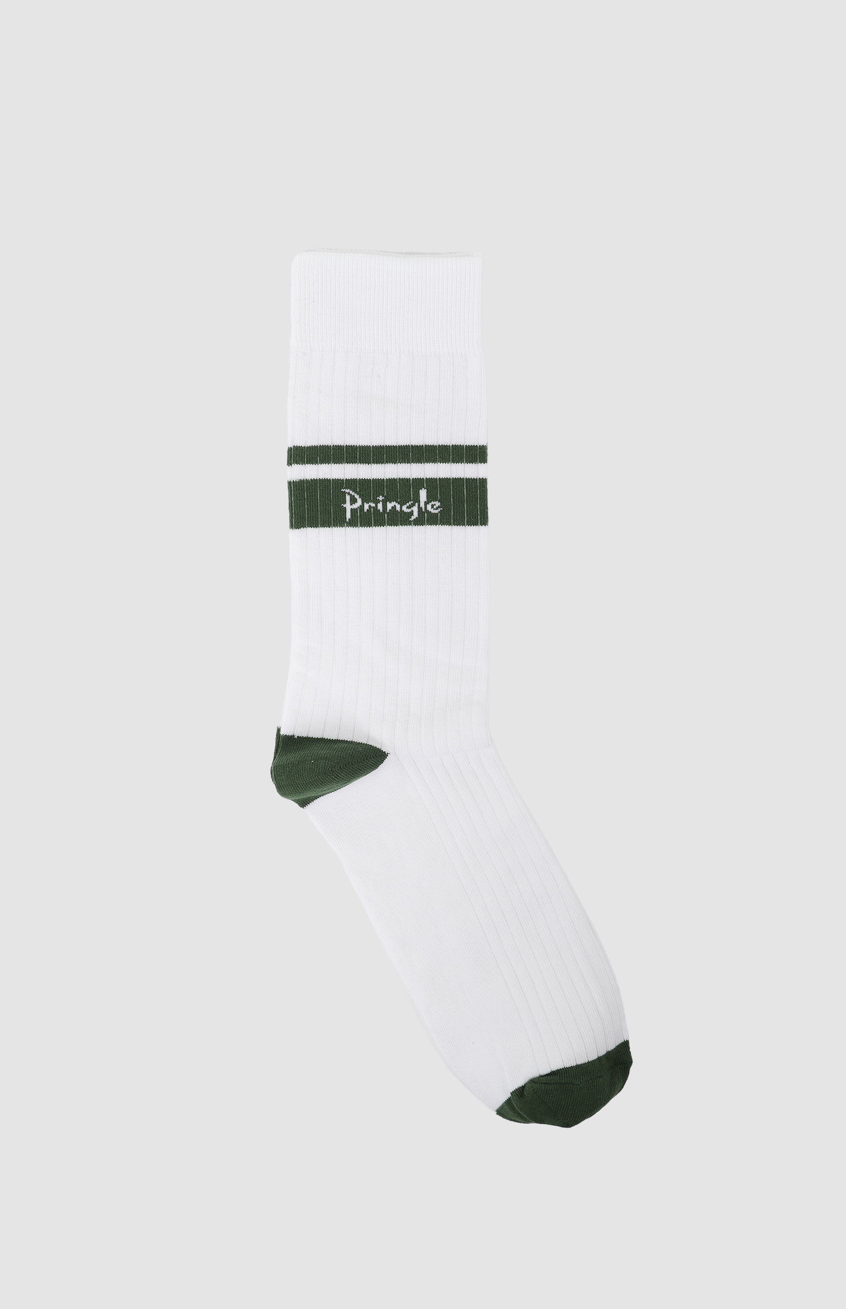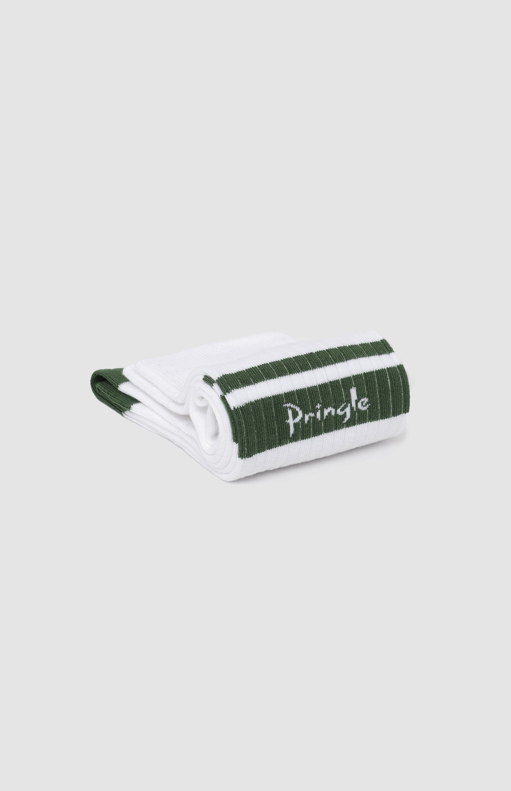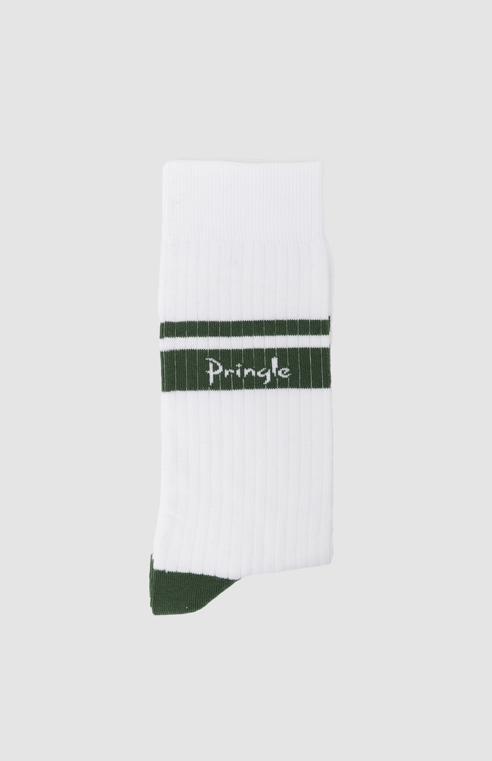 Sporting heritage meets everyday style in the Jesse Sock. This ribbed white sock features two bold stripes in iconic green, with the Pringle name knitted into one stripe—a nod to classic rugby aesthetics. With its clean silhouette and athletic edge, the Jessie brings a fresh energy to the Unity Collection while honouring the game that inspired it.